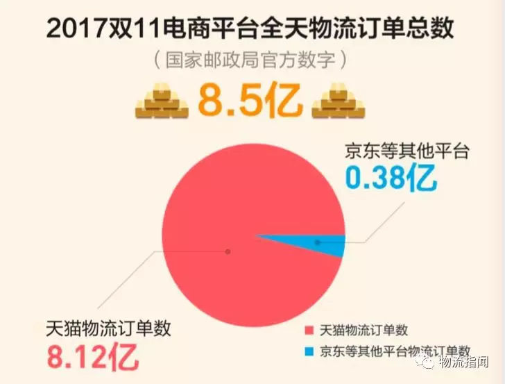 先從我們比較關心的物流數據說起,其中特別具有代表性的就是中國快遞數據: 2017年全國快遞業務量完成400.6億件,是2007年的33.4倍,十年間每年年均增長42%。這一數量達到日本的10倍,占全球總量的一半。在2017年的400億快遞中68%來自服務電商,全年收入近5000億元,對全球包裹快遞增長貢獻率超50%。 第三方機構根據阿里2017財年(2016.4-2017.3)年報數據推測:2017財年菜鳥網絡及其物流合作伙伴在零售市場共處理約166億個包裹。同期國內快遞行業業務總量為331億個,則菜鳥平臺業務量占行業總比例約為50.15%。所以,菜鳥平臺體量獨占中國快遞的半壁江山。 從2017年雙11的物流數據看,菜鳥的物流承載能力已經成為了中國電商核心載體。如圖: