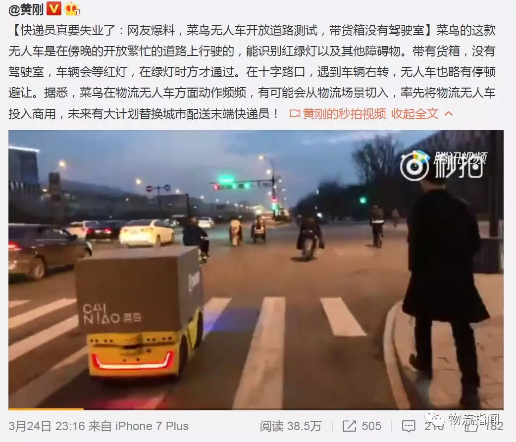 3月24日的最新消息,菜鳥的無人配送車輛已經在大街上開始測試了。菜鳥的這款無人車是在傍晚的開放繁忙的道路上行駛的,能識別紅綠燈以及其他障礙物。帶有貨箱,沒有駕駛室,車輛會等紅燈,在綠燈時方才通過。在十字路口,遇到車輛右轉,無人車也略有停頓避讓。據悉,菜鳥在物流無人車方面動作頻頻,有可能會從物流場景切入,率先將物流無人車投入商用。